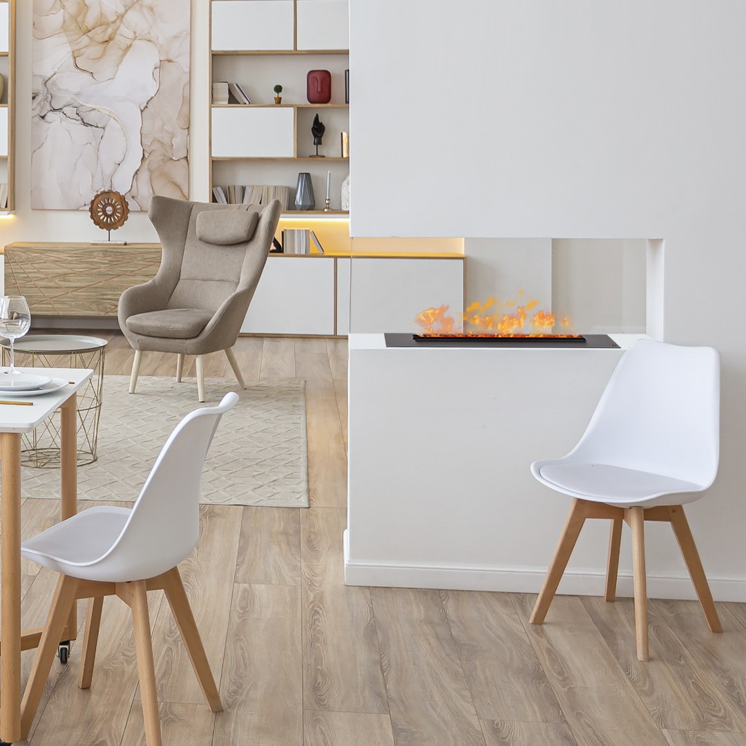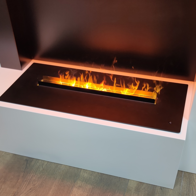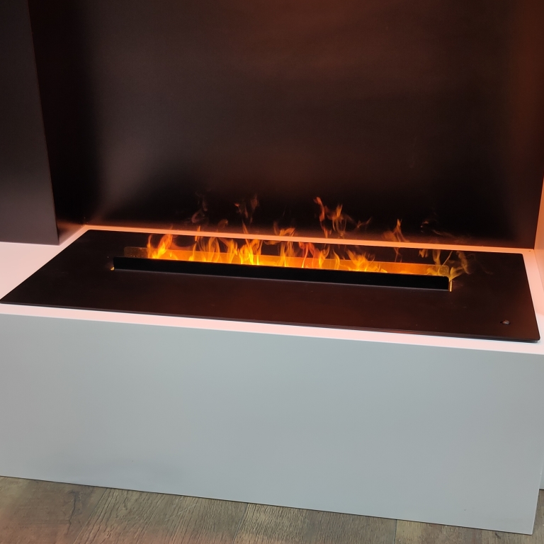 Имитация огня выполнена за счет водяного пара от встроенного увлажнителя воздуха и подсветки черной металлической панели для минималистичного интерьера – такой реалистичной, что ваши гости не отличат от настоящего костра!