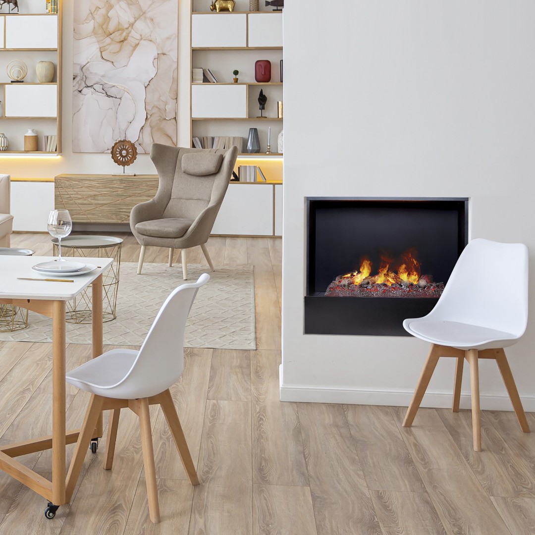 Паровое пламя электрокамина будет увлажнять воздух, а его высоту можно регулировать с помощью пульта управления. Также есть функция звукового эффекта потрескивания дров.