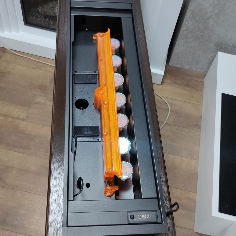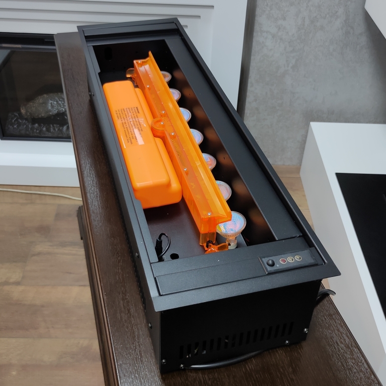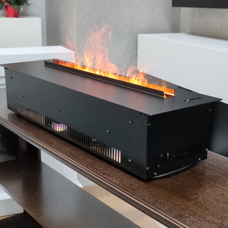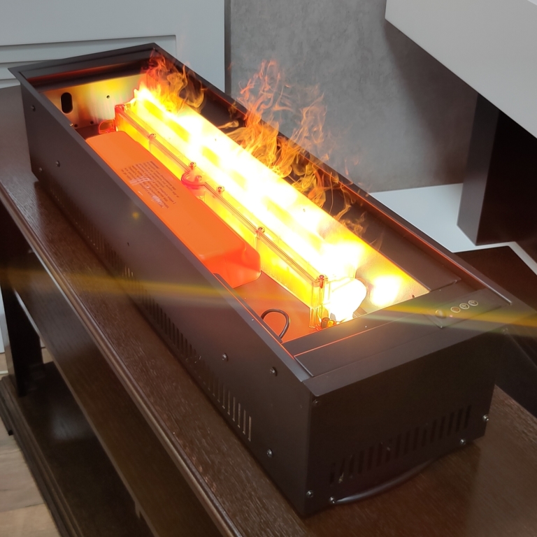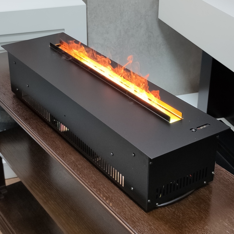 Имитация огня выполнена за счет водяного пара и подсветки черной панели для минималистичного интерьера – такой реалистичной, что ваши гости не отличат от настоящего костра!