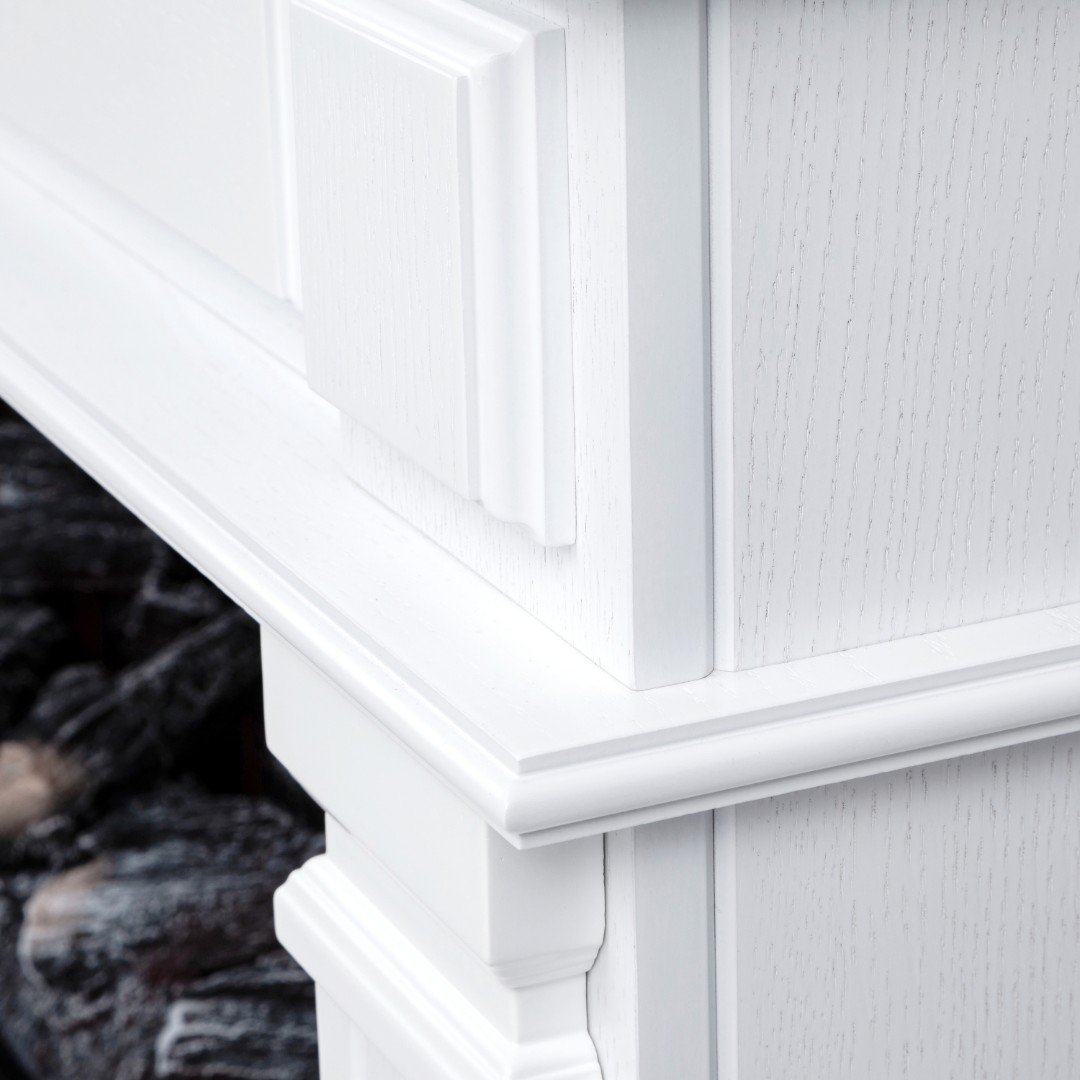 Прочное покрытие из шпона, классическая крышка и сдержанные геометрические декоративные элементы в сочетании с одним из лучших и впечатляющих очагов.